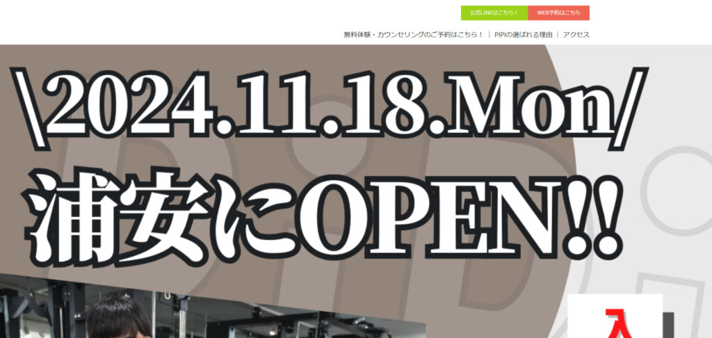 | 9 | PiPI PERSONAL GYM 浦安店 | 浦安市北栄1丁目16−14 TC83浦安ビル4階 | 入会金 20,000 円 月4回 35,200円 | Web予約、LINE、電話 | 5.0★(3件) |