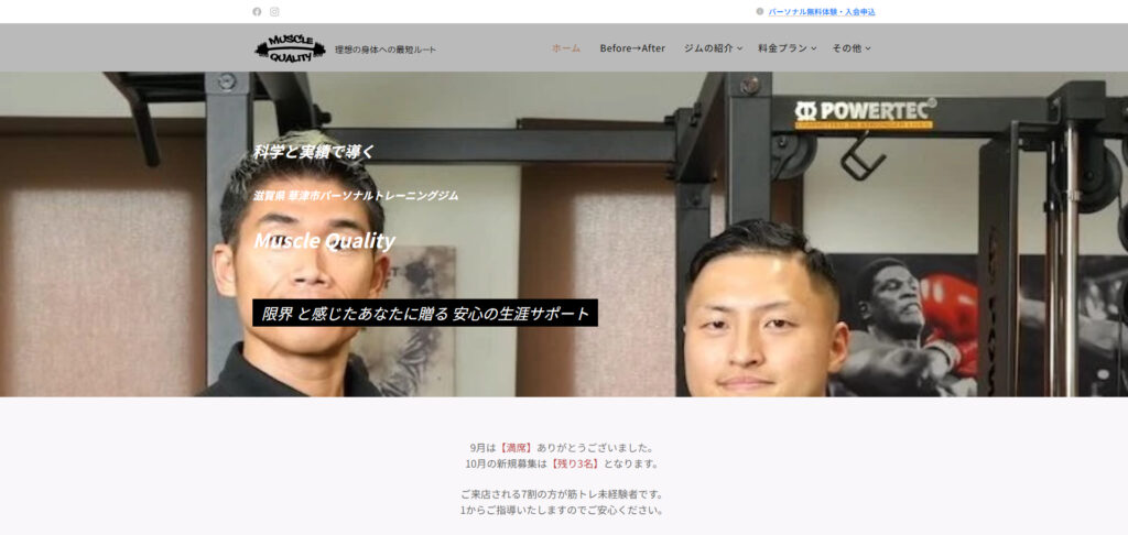 | 5 | Muscle Quality 草津店 | 草津市東矢倉2丁目5−36 189ビル 5F | 入会金 33,000円 ショートコース 16回(2ヶ月) 248,600円 |