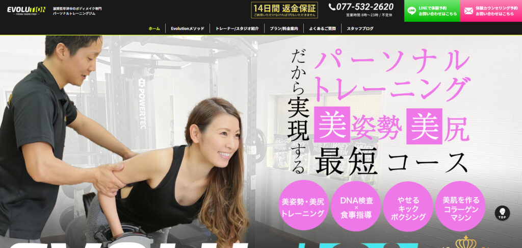 | 12 | Evolution 滋賀草津スタジオ | 草津市木川町648-3 GOSキックボクシングジム館… | 初期費用 不明 美姿勢・美尻コース 2ヶ月 217,800円 |