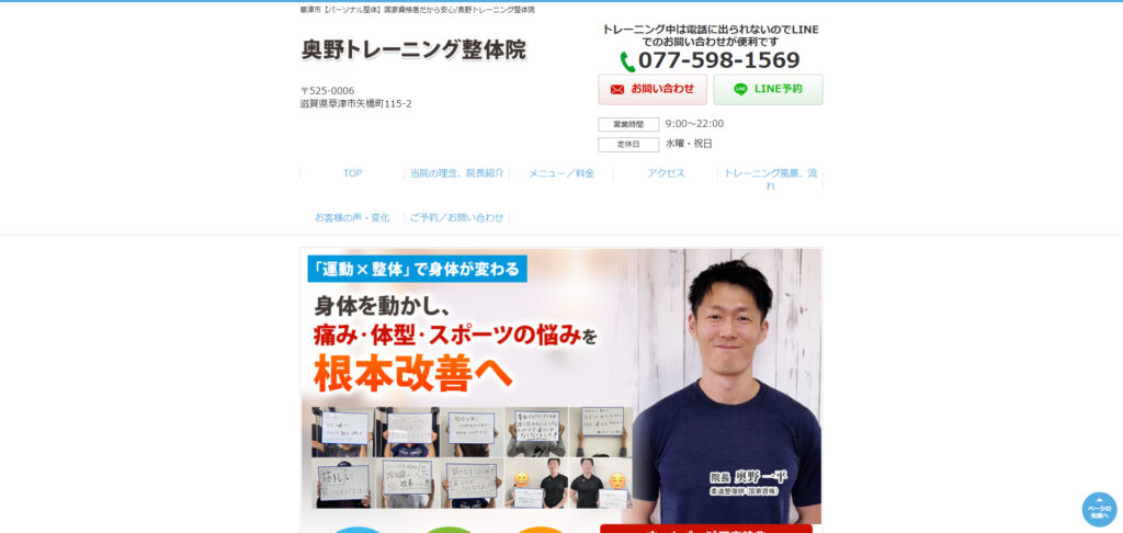 | 15 | 奥野トレーニング整体院 | 草津市矢橋町115-2 | 入会金 0円 50分コース 4回チケット 22,000円 |