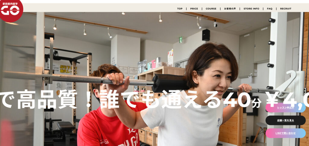 | 1 | 街ナカ筋肉留学GO 草津店 | 草津市東草津1-4-53 ビワコホンダビル3階 | 入会金 0円 週1プラン/60分 12カ月 月24,000円 |