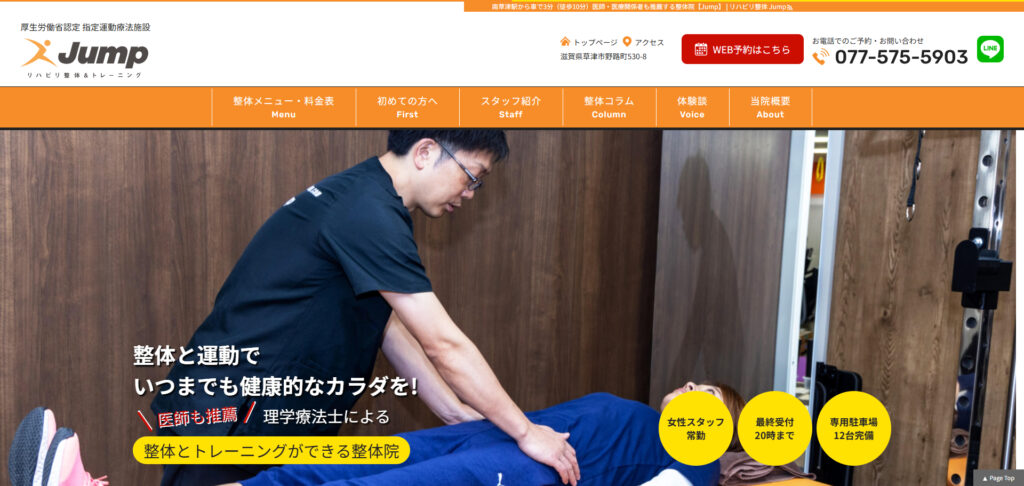 | 3 | リハビリ整体&トレーニングJump | 草津市野路町530-8 | 入会金 9,780円 ジム+パーソナル30分×4 月27,780円 |