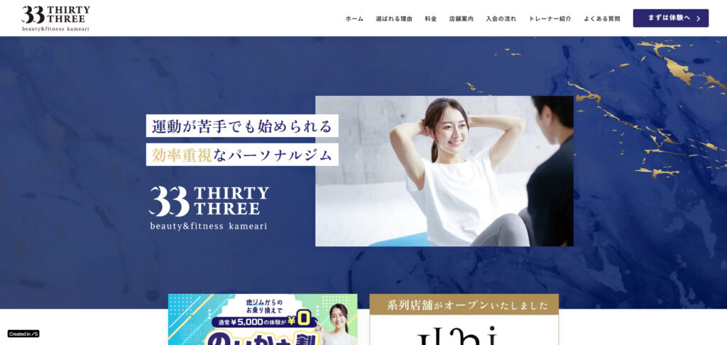 7 | beauty&fitness 33 亀有店 | 葛飾区亀有3丁目27−1 スリーパレス201号室 | 体験 5,000 円 短期集中 200,000 円 |